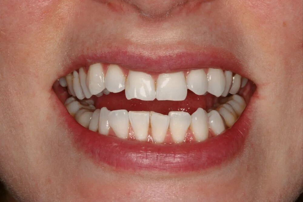 Chipped and crooked teeth due to grinding and a malocclusion (bad bite) that was never corrected.